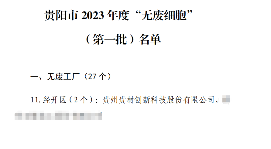 近日,貴陽市 2023 年度“無廢細胞”(第一批)名單已經市“無廢城市”建設工作領導小組審定,貴州貴材創新科技股份有限公司(以下簡稱“貴材科技”)榮獲貴陽市2023年度“無廢工廠”稱號。