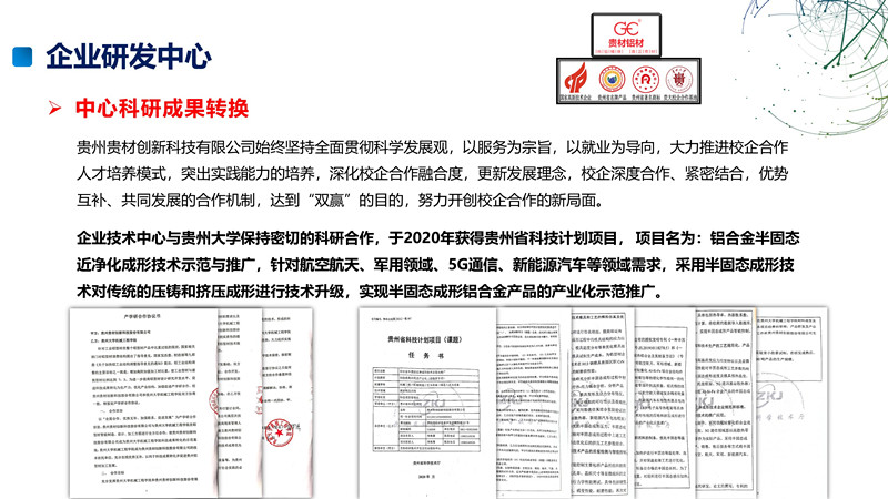 貴州貴材是一家注重知識產權保護和核心技術投入的國家高新技術企業,企業于2018年1月正式成立研發中心,專注于行業產品的核心技術攻關。中心多次利用企業自身生產技術積累優勢和廣闊銷售渠道來積極推廣自身科技成果轉換。與貴州大學,貴州理工大學等知名院校專家在型材原材料,工業模具設計,型材生產工藝,終端消費品開發,航空用