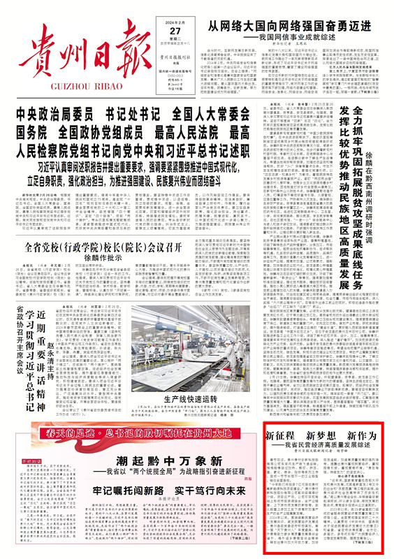如今,一位位民營經濟人士投資貴州、一家家民營企業迅速崛起,在各級黨委政府的引導支持下,廣大民營經濟人士在黔貴大地實現夢想,眾多民營企業乘勢而上,為推進中國式現代化貴州實踐貢獻力量。