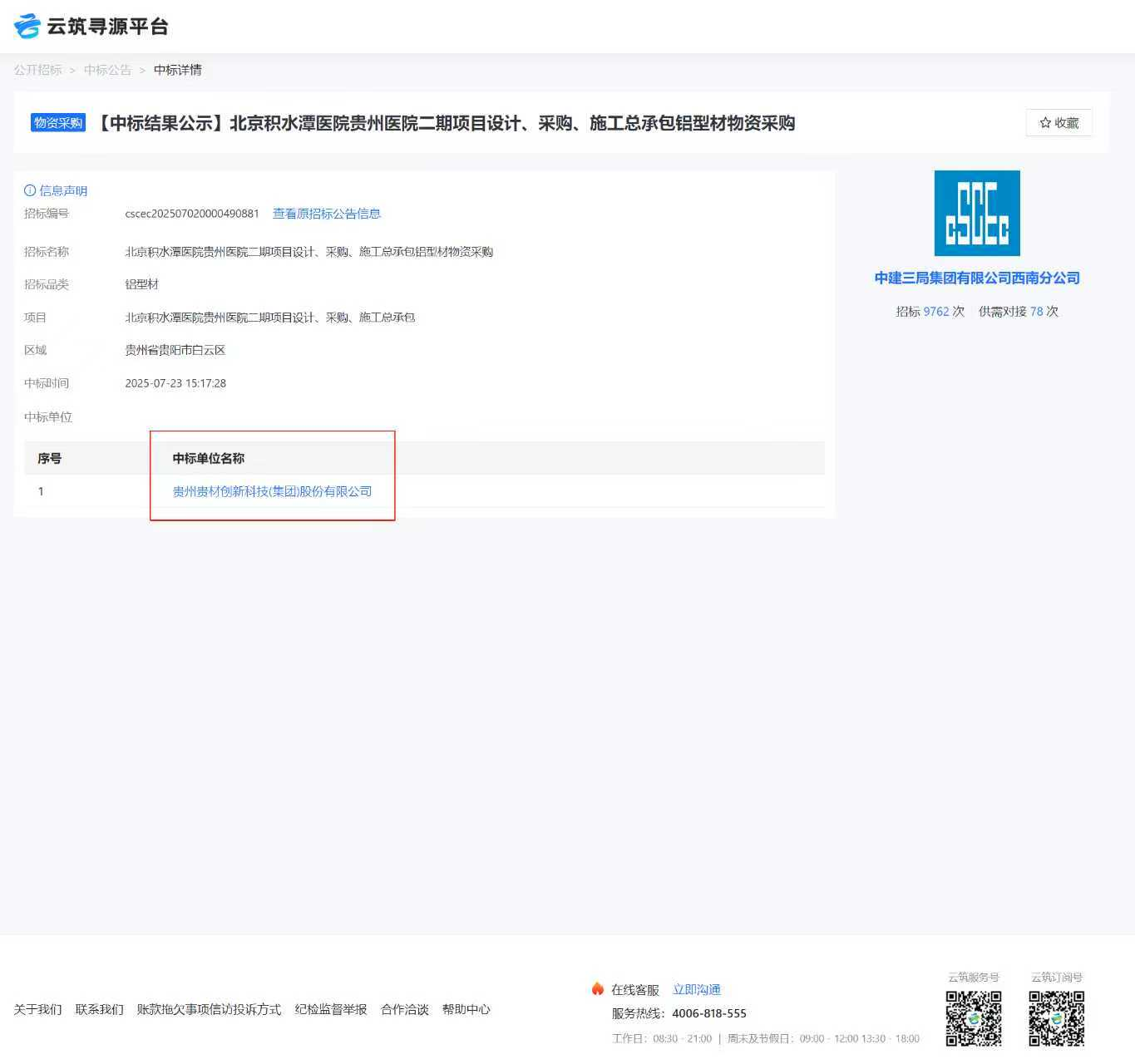 貴材科技(集團)中標中建三局(集團)北京積水潭醫院貴州醫院二期項目